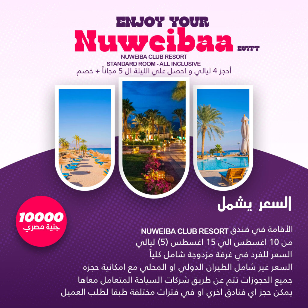 السعر 10000 جنية مصري السعر يشمل Nuweiba Club Resort الاقامة في فندق من 10 اغسطس الي 15 اغسطس 5 ليالي السعر للفرد في غرفة مزدوجة شامل كليا السعر غير شامل الطيران الدولي او المحلي مع امكانية حجزة جميع الحجوزات تتم عن طريق شركات السياحة المتعامل معاها يمكن حجز اي فنادق اخري او في فترات مختلفة […]