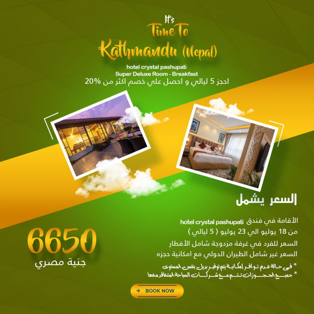 السعر 6650 جنية مصري السعر يشمل hotel crystal pashupati الاقامة في فندق من 18 يوليو الي 23 يوليو 5 ليالي السعر للفرد في غرفة مزدوجة شامل الافطار السعر غير شامل الطيران الدولي مع امكانية حجزة