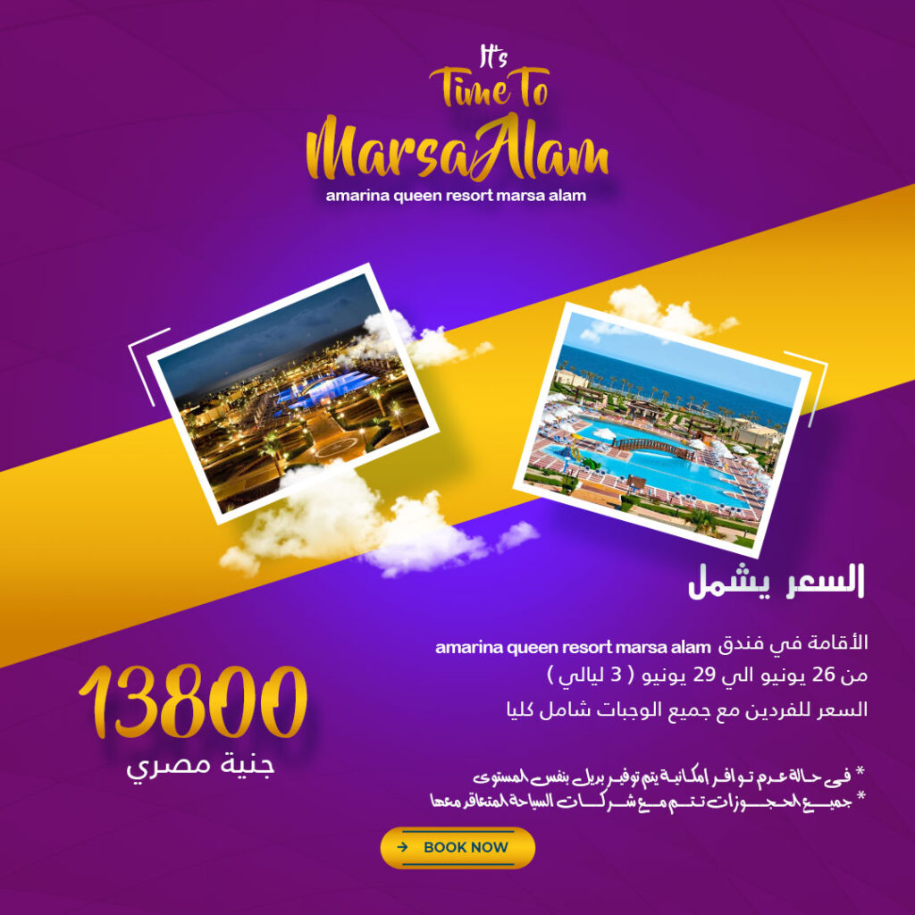 السعر 13800 جنية مصري السعر يشمل amarina queen resort marsa alam الاقامة في فندق من 26 يونيو الي 29 يونيو 3 ليالي السعر للفردين مع جميع الوجبات شامل كليا