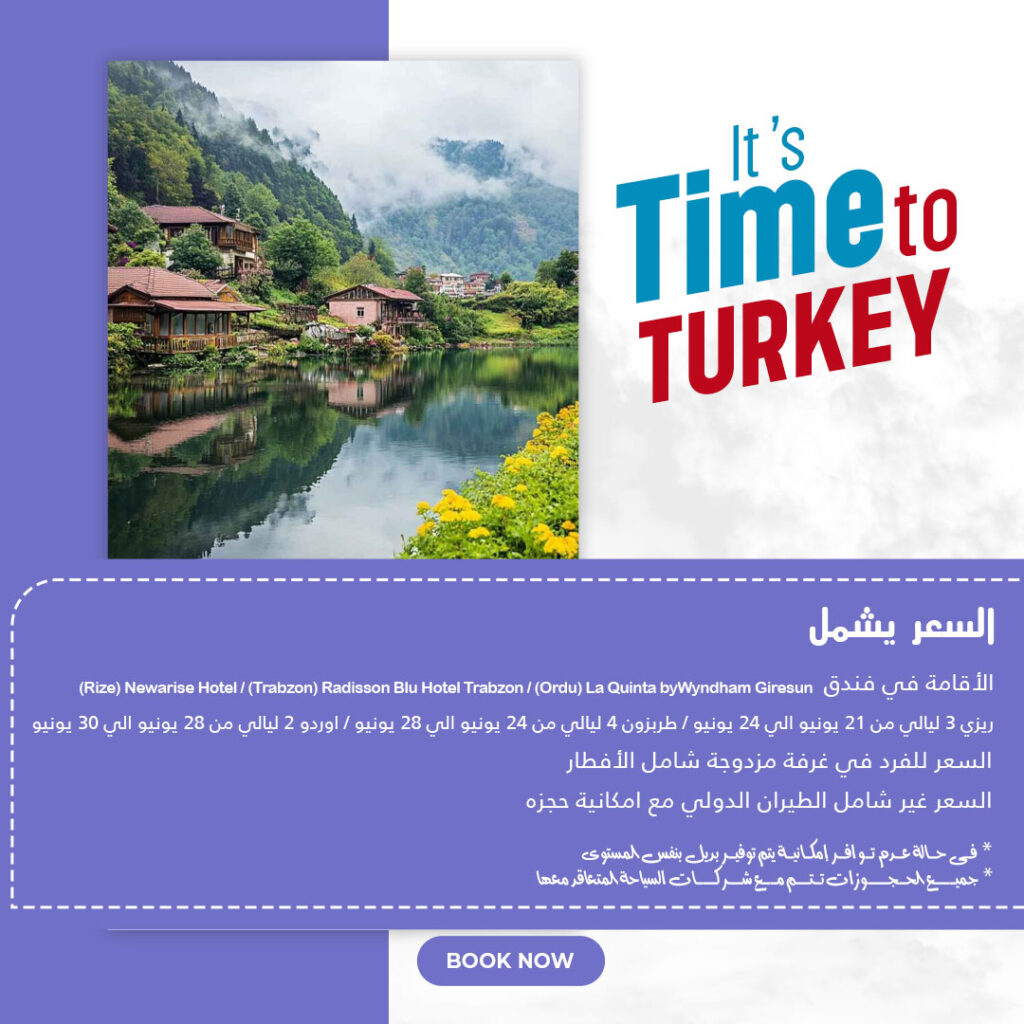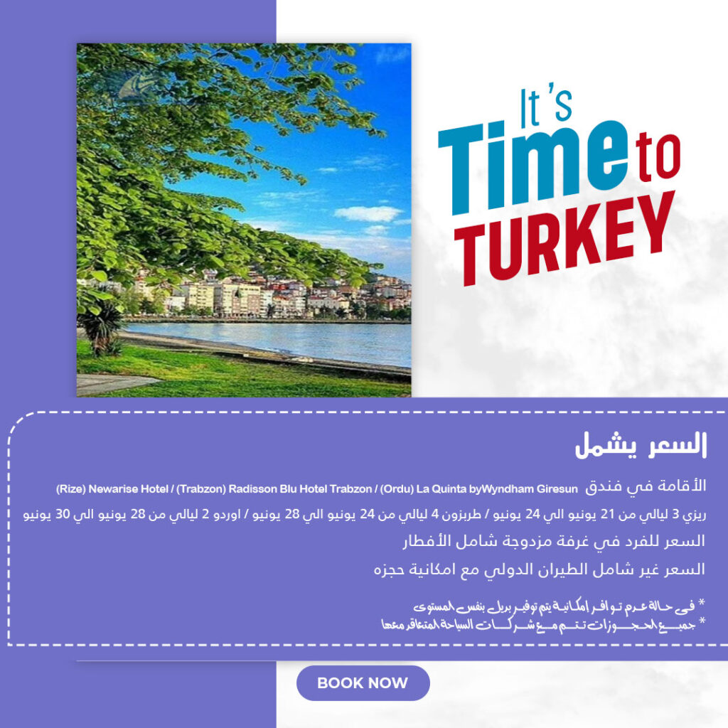 السعر يشمل الاقامة في فندق (Rize) Newarise Hotel (Trabzon) Radisson Blu Hotel Trabzon (Ordu) La Quinta byWyndham Giresun ريزي 3 ليالي من 21 يونيو الي 24يونيو/طربزون 4 ليالي من 24 يونيو الي 28 يونيو/ اوردو 2 ليالي من 28 يونيو الي 30 يونيو السعر للفرد في غرفة مزدوجة شامل الافطار السعر غير شامل الطيران الدولي […]