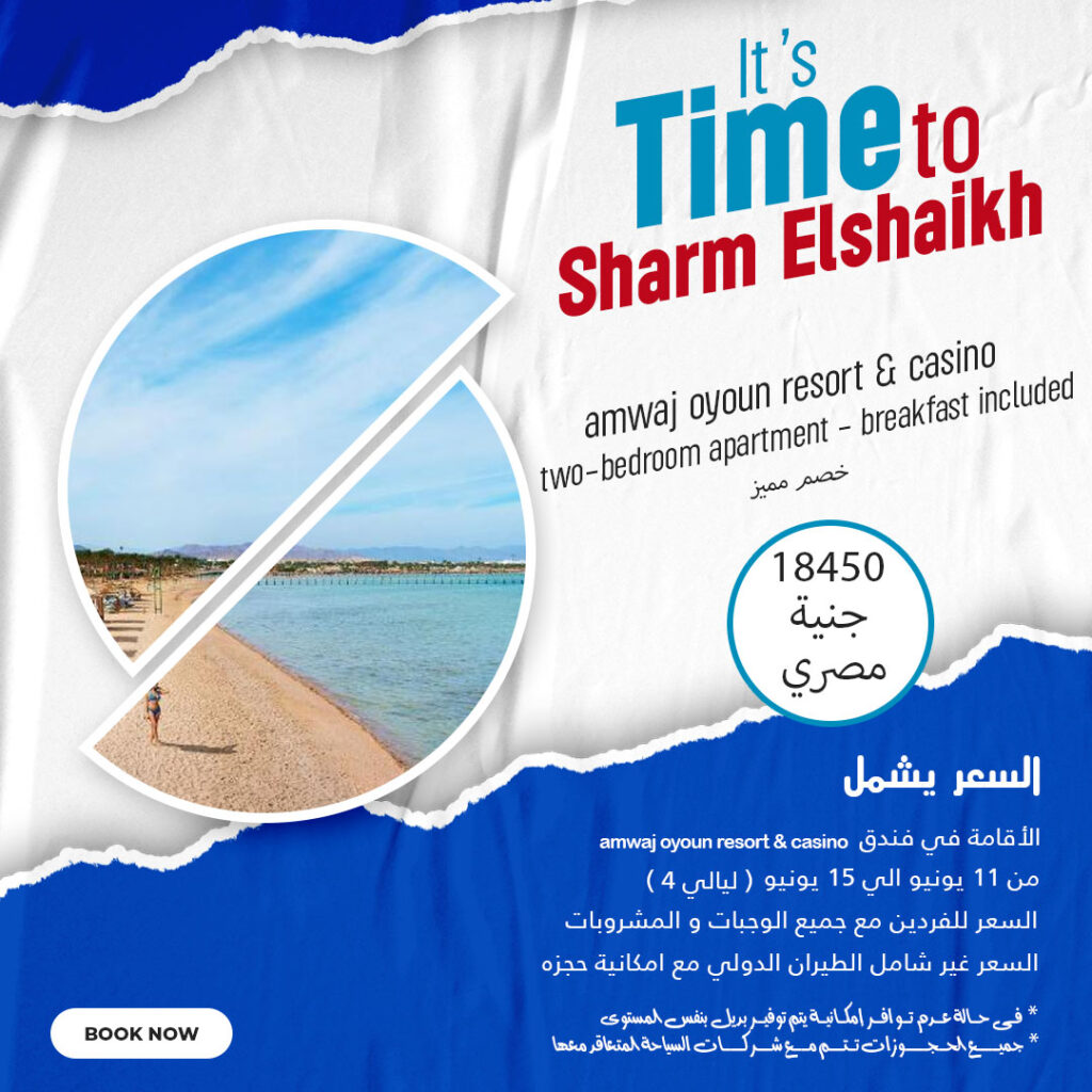 السعر 18450 جنية مصري السعر يشمل الاقامة في فندق amwaj oyoun resort & casino من 11 يونيو الي 15 يونيو 4 ليالي السعر للفردين مع جميع الوجبات والمشروبات السعر ىغير شامل الطيران الدولي مع امكانية حجزة