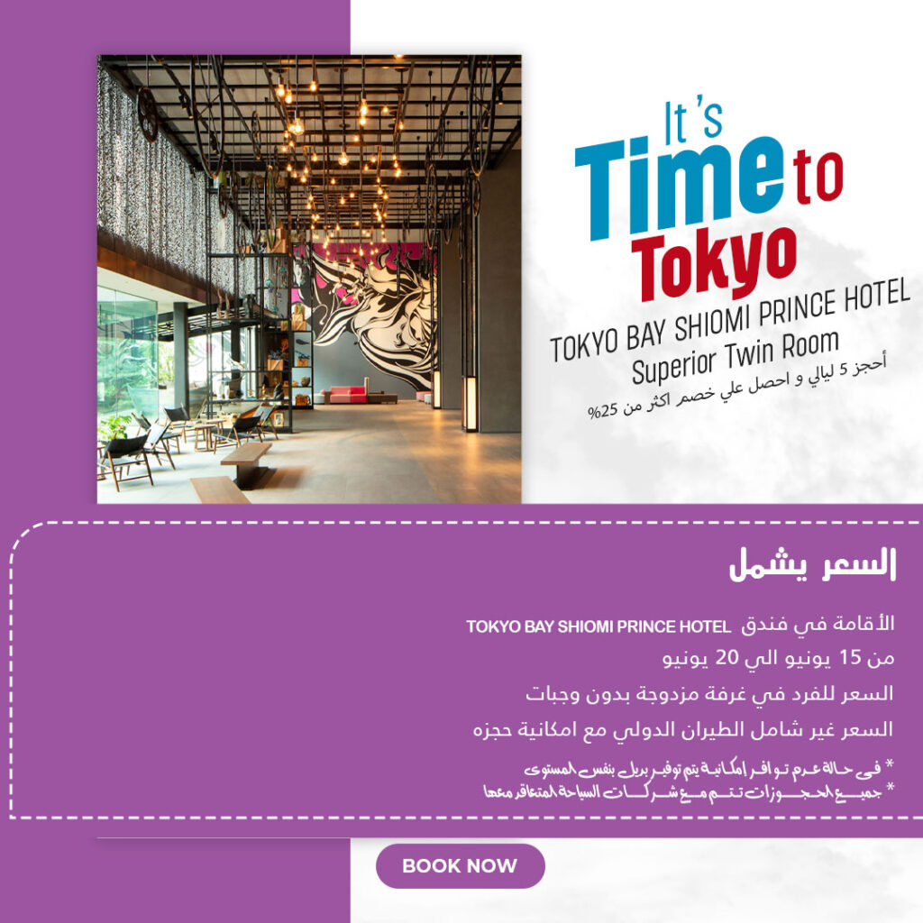 السعر يشمل الاقامة في فندق Tokyo Bay Shiomi Prince Hotel من 15 يونيو الي 20 يونيو 5 ليالي السعر للفرد في غرفة مزدوجة بدون وجباتالسعر غير شامل الطيران الدولي مع امكانية حجزة