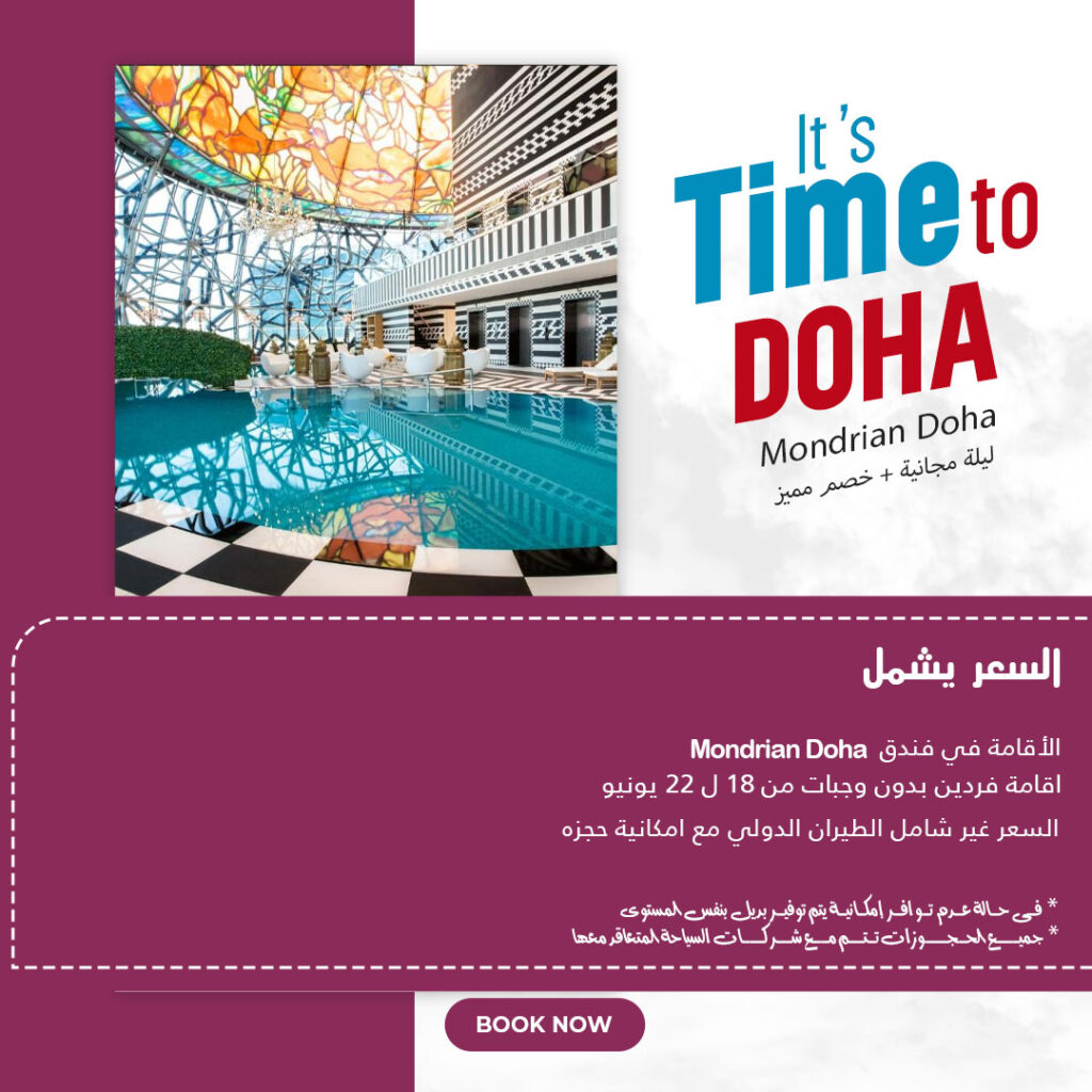 السعر يشمل mondrian doha الاقامة في فندق اقامة فردين بدون وجبات من 18 ل 22 يونيو السعر غير شامل الطيران الدولي مع امكانية حجزة