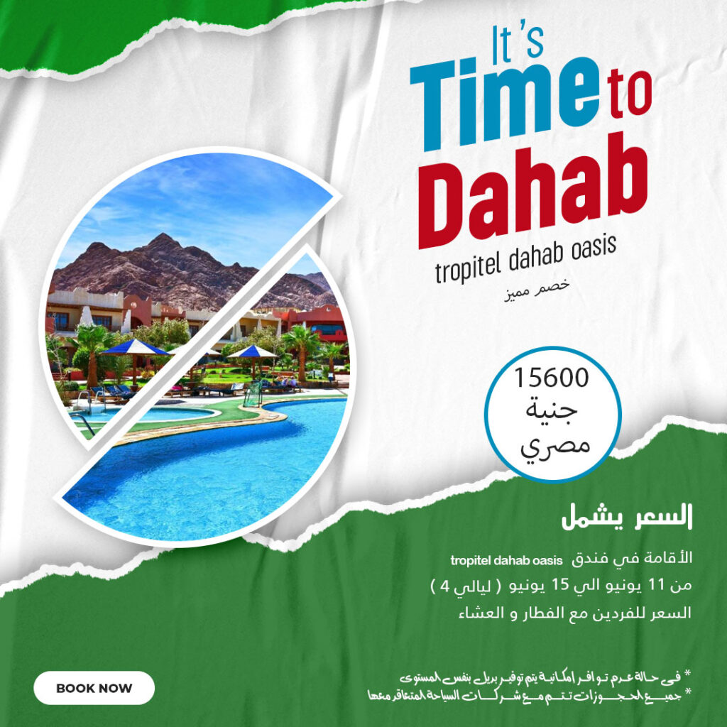 السعر 15600 جنية مصري السعر يشمل tropital dahab oasis الاقامة في فندق من 11 يونيو الي 15 يونيو 4 ليالي السعر للفردين مع الفطار والعشاء