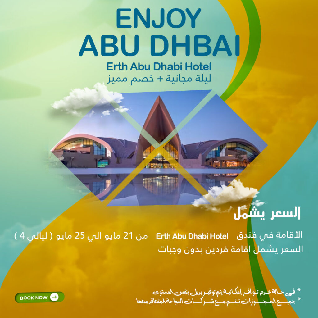 السعر يشمل Erth Abu Dhabi Hotelالاقامة في فندق من 21 مايو الي 25 مايو 4 ليالي السعر يشمل اقامة فردين بدون وجبات