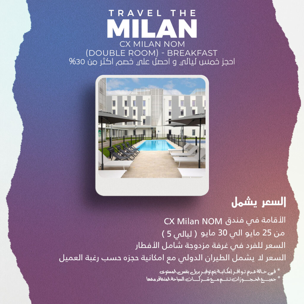 السعر يشمل Cx Milan Nom الاقامة في فندق (من 25 مايو الي 30 مايو( 5 ليالي السعر للفرد في غرفة مزدوجة شامل الافطار السعر لايشمل الطيران الدولي مع امكانية حجزة حسب رغبة العميل