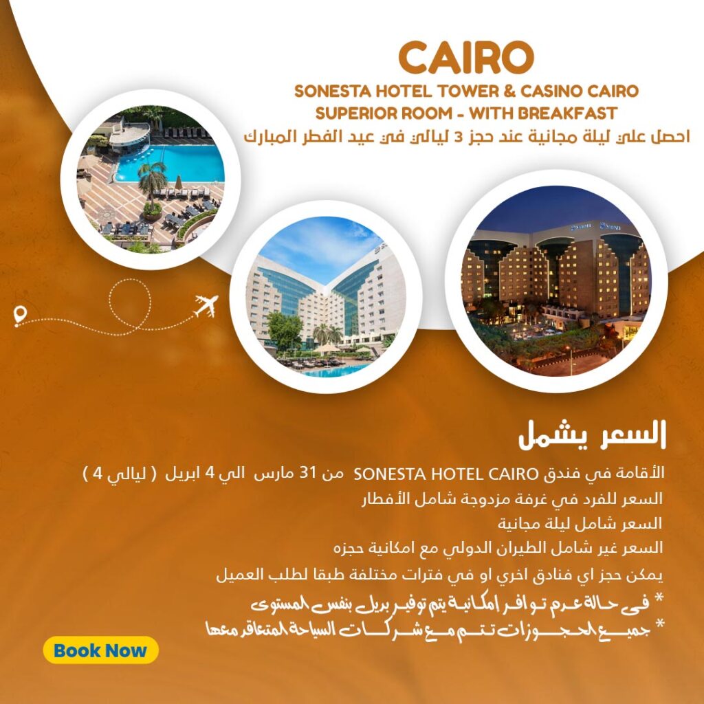 السعر يشمل Sonesta Hotel Tower & Casino Cairo الاقامة في فندق (من 31 مارس الي 4 ابريل( 4 ليالي السعر للفرد في غرفة مزدوجة شامل الافطار السعر شامل ليلة مجانية السعر غير شامل ىالطيران الدولي مع امكانية حجزة يمكن حجز اي فنادق اخري او في فترات مختلفة طبقا لطلب العميل