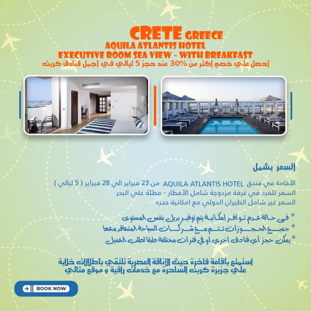 السعر يشمل AQUILA ATLANTIS HOTEL الاقامة في فندق (من 23 فبراير الي 28 فبراير( 5 ليالي السعر للفرد في غرفة مزدوجة شامل الافطار مطلة علي البحر السعر غير شامل الطيران الدولي مع امكانية حجزه