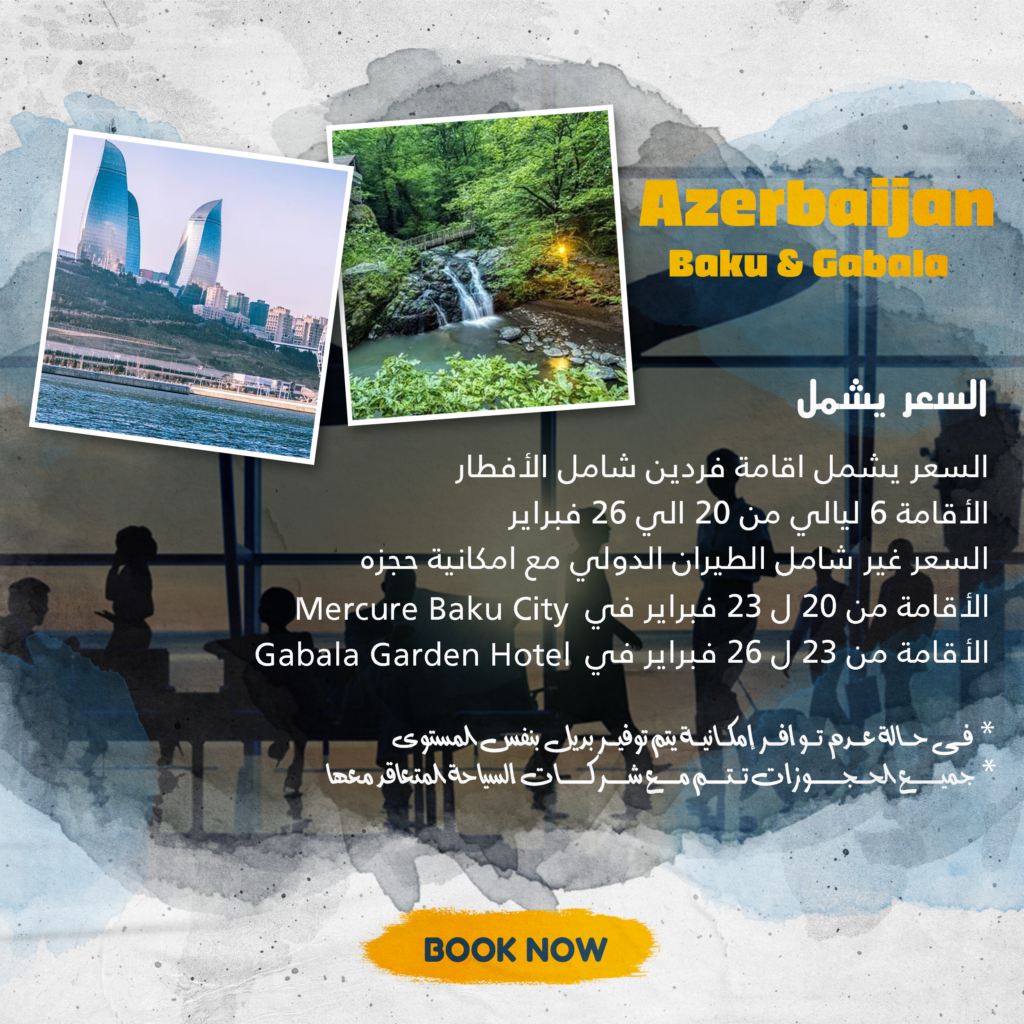 السعر يشمل اقامة فردين شامل الافطار الاقامة 6 ليالي من 20 الي 26 فبراير السعر غير شامل الطيران الدولي مع امكانية حجزة Mercure baku city الاقامة من 20 ل23 فبراير في Gabala Garden Hotel الاقامة من 23 ل 26 فبراير