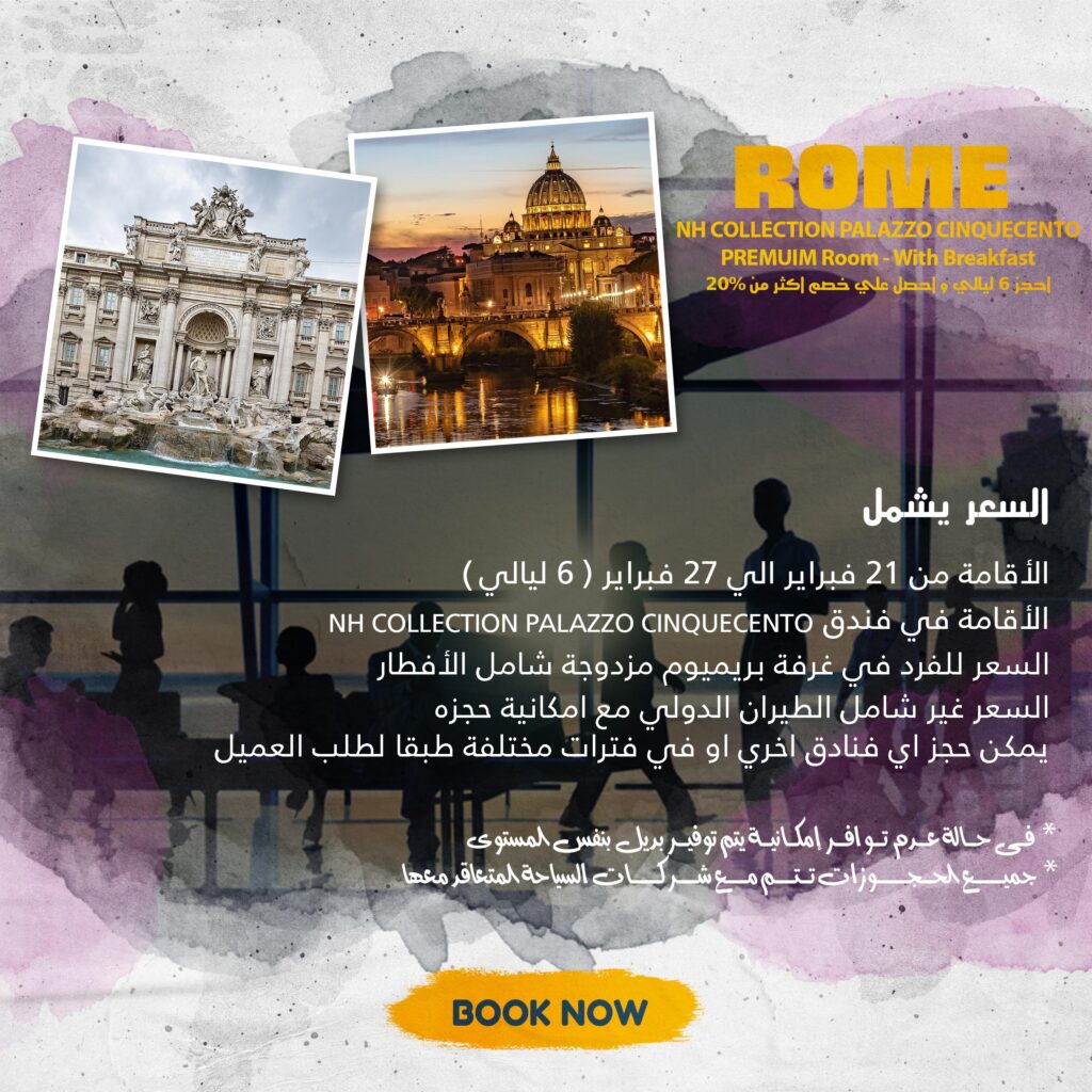 السعر يشمل (الاقامة من 21 فبراير الي 27 فبراير( 6 ليالي Nh collection palazzo cinquecentoالاقامة في فندق السعر للفرد في غرفة بريميوم مزدوجة شامل الافطار السعر غير شامل الطيران الدولي مع امكانية حجزه يمكن حجز اي فنادق اخري او في فترات مختلفة طبقا لطلب العميل