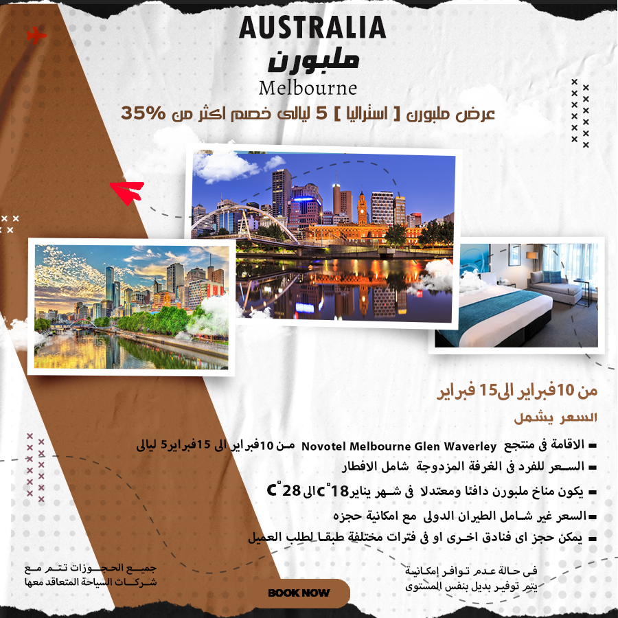 السعر يشمل الاقامة في فندق novotel melbourne glen waverley من 10 فبراير الي 15 فبراير 5 ليالي السعر للفرد في الغرفة المزدوجة شامل الافطار 28 يكون مناخ ملبورن دافئا ومعتدلا في شهر يناير 18 الي السعر غير شامل الطيران الدولي مع امكانية حجزه يمكن حجز اي فنادق اخري او في فترات مختلفة طبقا لطلب العميل