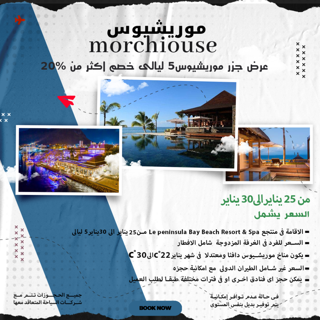 السعر يشمل من 25 يناير الي30 يناير 5 لياليle peninsula bay beach resort & spa الاقامة في منتجع السعر للفرد في الغرفة المزدوجة شامل الافطار يكون مناخ موريشيوس دافئا ومعتدلا في شهر يناير 22 الي 30 السعر غير شامل الطيران الدولي مع امكانية حجزه يمكن حجز اي فنادق اخري او في فترات مختلفة طبقا لطلب […]
