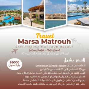 السعر 26000 جنية مصري السعر يشمل SAFIR MARSA MATROUH RESORT الأقامة في فندق من 15 [...]